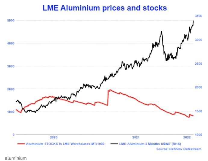 Данные PMI, опубликованные во вторник, подтвердили восстановление заводских цепочек поставок в феврале. Но товарный след России представляет угрозу — кроме нефти и газа Россия производит половину мирового палладия, 14% платины и 6-7% алюминия. Цены на алюминий достигли рекордного уровня, сообщается о перебоях с поставками из Украины.