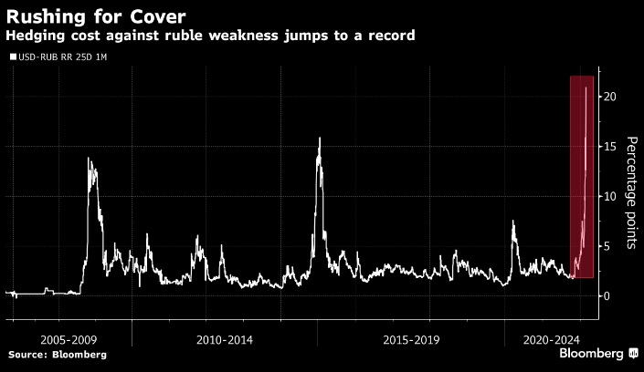 Индикативный спред спроса и предложения для курса доллара к рублю оказался самыи широкии по крайней мере с начала ноября, согласно данным, собранным Bloomberg. Стоимость хеджирования убытков в российской валюте выросла до рекордно высокого уровня, согласно месячному риск-развороту.
