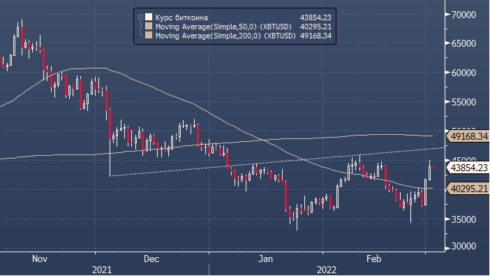 На фоне ужесточения контроля за движением капитала биткоин может в ближайшее время подняться выше $45 000 за монету, если, конечно, теория полезности криптовалюты во время геополитических обострений верна. При таком раскладе технические аналитики рынка криптовалют указывают в качестве ближайшей цели уровень $50 000 за биткоин.