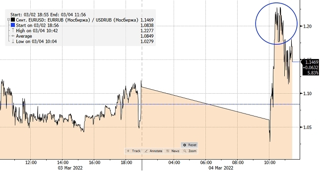 Так, доллар к рублю на старте торгов подскочил до 115,00, но затем резко упал до 100,00. При этом курс евро к рублю подскочил до 126,00. Если рассчитать синтетический курс евро к доллару (EURUSD) через рубль (разделить курс евро/рубль на курс доллар/рубль), то получится, что в утренние часы синтетический EURUSD на Мосбирже достигал 1,2280, при этом на международном валютном рынке Forex EURUSD торговался в тот же момент на уровне 1,1010. Следовательно, премия синтетического курса к внешнему курсу EURUSD составляла в какой-то момент 11,5%.