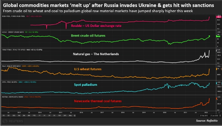 Мировые товарные рынки «таяли» после того, как Россия начала операцию в Украине. График Reuters