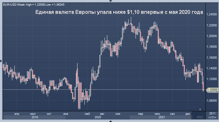 Единая валюта Европы упала ниже $1,10 впервые с мая 2020 года и близка к ключевому уровеню поддержки , который восходит к созданию евро в 1999 году. Из-за геополитических рисков и меняющихся ожиданий денежно-кредитной политики во всем мире евро упал до 1,0973 доллара после того, как в пятницу российские войска заняли территорию крупнейшей в Европе атомной электростанции.