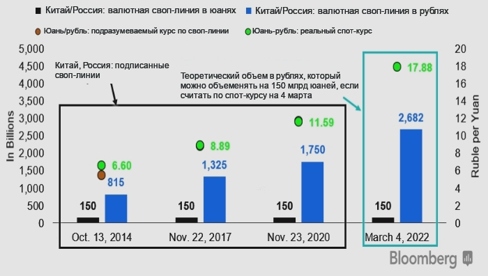 Инвесторы могут быть более лояльны к юаню по сравнению с рублем, учитывая, что юань является безопасным убежищем в условиях украинского кризиса. Центральный банк России располагает резервными активами в юанях на сумму 76 миллиардов долларов по состоянию на 2 квартал 21 года (более свежих точных данных нет). Также есть открытая своп-линия на сумму 150 миллиардов юаней (возобновлённая в 2020 году) с Китаем. Эта своп-линия даже предлагает более дешевую стоимость юаня для России по сравнению со спотовым обменным курсом.