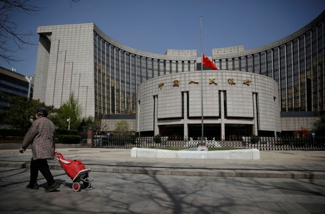 Китайский национальный флаг приспущен в штаб-квартире Народного банка Китая, центрального банка (НБК), поскольку Китай проводит национальный траур по умершим от коронавирусной болезни (COVID-19), на могиле Цинмин - масштабный фестиваль в Пекине, Китай, 4 апреля 2020 г. REUTERS/Carlos Garcia Rawlins