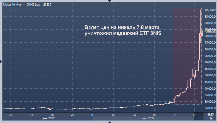 Тройной медвежий ETF на никель (WisdomTree Nickel 3x Daily Short, тикер: 3NIS), созданный таким образом, чтобы приносить владельцам паев трехкратную прибыль в случае снижения цен на никель, прекратил свое существование. 3NIS пал жертвой невиданного взлета цен на этот промышленный металл, который имел место 7–8 марта.