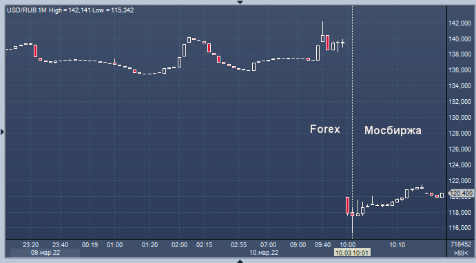 До открытия торгов на Мосбирже рубль подучал котировки от международного межбанковского валютного рынка Forex, где мировые банки торгуют друг с другом и где нет полноценного спроса и предложения рубля. На этом внешнем рынке котировки рубля были сильно занижены. Так, евро к рублю стоил на 30 рублей дороже.