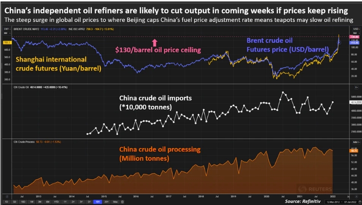 Независимые нефтеперерабатывающие заводы Китая намерены сократить производство в ближайшие недели, поскольку вызванный конфликтом на Украине рост цен на нефть снижает маржу. Скачок выше 130 долларов за баррель обеспокоил производителей, торговых руководителей и аналитиков.