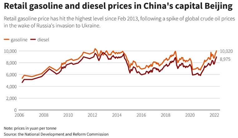 Потребители также ощутили на себе давление почти рекордных цен. Розничные цены на бензин в столице страны Пекине на этой неделе достигли 8,56 юаня (1,35 доллара США) за литр, что является самым высоким показателем с февраля 2013 года.