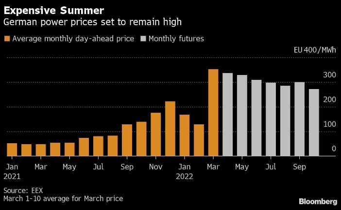Одним из самых явных признаков того, что рынок электроэнергии перевернулся с ног на голову, поскольку конфликт на Украине делает поставки энергии более неопределенными, стало то, что немецкие энергетические фьючерсы с поставкой в июле почти в шесть раз дороже, чем с поставкой в декабре, в среднем за последние десять лет. Беспрецедентный скачок в динамике рынка показывает, насколько взаимосвязанными становятся энергетические рынки региона, поскольку стоимость газа теперь определяет, сколько платит за электроэнергию каждый, от завода в Германии до дома в Испании.