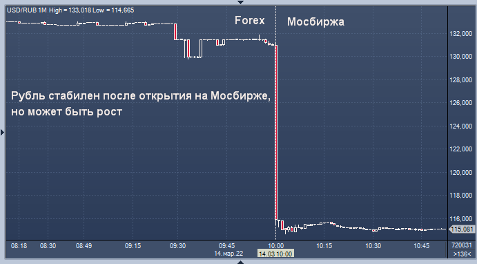 До открытия торгов на Мосбирже рубль получал котировки от международного межбанковского валютного рынка Forex, где мировые банки торгуют друг с другом и где нет полноценного спроса и предложения рубля. На этом внешнем рынке котировки рубля были сильно занижены. Так, евро к рублю стоил на 30 рублей дороже. Что касается дальнейшей динамики рубля, то здесь все будет зависеть от экспортеров, которые могут активизироваться ближе к началу налогового периода. Они теперь обязаны будут продавать 80% валюты от своей иностранной выручки. Спрос на евро и доллар со стороны российских импортеров вскоре сократится из-за санкций на многие виды товаров, введенные Западом.