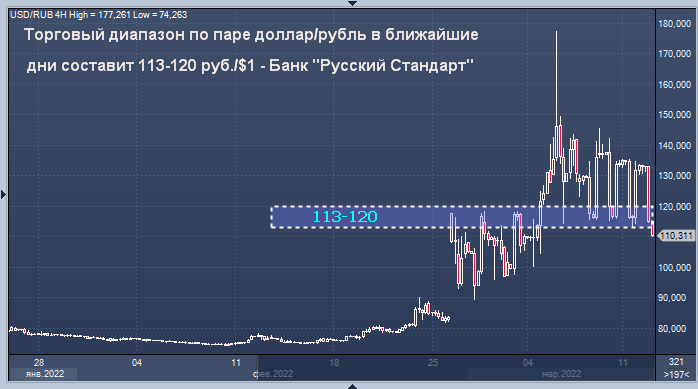 Диапазон колебаний курса по доллар/рублю в ближайшие дни составит 113-120 руб./$1, а по паре евро/рубль - 120-127 руб./EUR1, заявил директор департамента операций на финансовых рынках банка "Русский Стандарт" Максим Тимошенко.