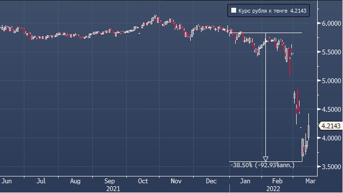 Рубль с начала года подешевел относительно казахстанского тенге на 38,5% по состоянию на 8 марта. Однако с тех пор восстановил часть потерь. Особенно заметно рубль укрепился к тенге именно после новостей о запрете вывоза наличных из Казахстана.