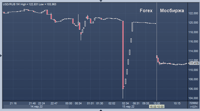 До открытия торгов на Мосбирже рубль получал котировки от международного межбанковского валютного рынка Forex, где мировые банки торгуют друг с другом и где нет полноценного спроса и предложения рубля. На этом внешнем рынке котировки рубля были сильно занижены. Так, евро к рублю стоил на 30 рублей дороже. Вскоре Минфин начнет предлагать погашение внешнего долга в рублях. И те компании-кредиторы России, которые согласятся принять такое погашение, будут продавать рубль на рынке Forex, так как операции внутри страны им запрещены пока.