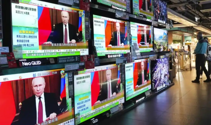 Телевизионные экраны в Гонконге транслируют последние новости о вторжении России в Украину. Власти США опасаются, что Китай может направить в Россию вооруженные беспилотники. Фотография: Vincent Yu/AP