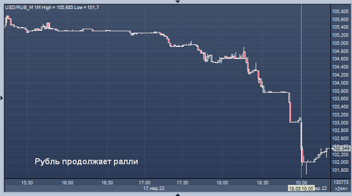 Пришли объемы, а вместе с ними и справделивый курс. Иначе как объяснить, что все последние дни курс доллара падает и падает. А значит курс рубля на рынке в первые дни марта можно поистине назвать не рыночным, а больше базарным (на Алиэкспрессе давали, например, 180). Рыночный курс — это тот курс, который отражает баланс спроса и предложения. Предложения не было ни от Центробанка, резервы которого были заблокированы третьими лицами, ни от экспортеров, которые сами пребыали в шоке и, возможно, берегли выручку ближе к налоговому периоду, то есть к настоящему времени.