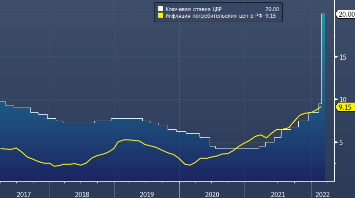 Напомним, ЦБР сегодня сохранил ставку после экстренного повышения из-за санкций до 20%.