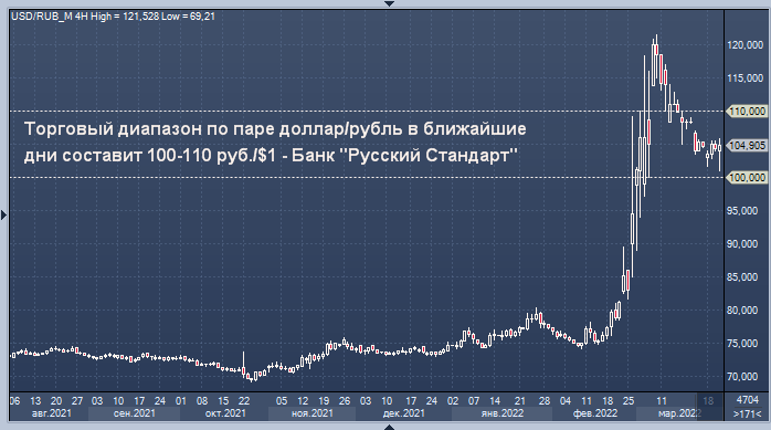 Диапазлн колебаний курса рубля к американскому доллару в ближайшие дни составит 100-110 руб./$1, а по паре евро/рубль - 110-120 руб./EUR1, заявил директор департамента операций на финансовых рынках банка "Русский Стандарт" Максима Тимошенко.
