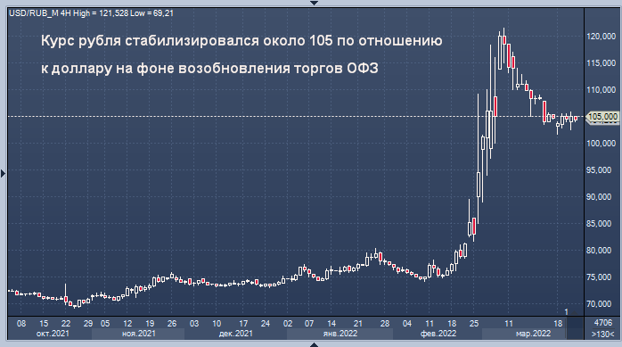 Российский рубль стабилизировался около 105 за доллар в Москве в понедельник, в то время как казначейские облигации ОФЗ вернулись к торгам всплеском волатильности. Россия надеется постепенно возобновить операции на своих финансовых рынках. Центральный банк сохранил ключевую процентную ставку на уровне 20% в пятницу после ее экстренного повышения в конце февраля и заявил, что начнет покупать облигации ОФЗ, когда Московская биржа возобновит торги этими бумагами в понедельник, надеясь ограничить волатильность.