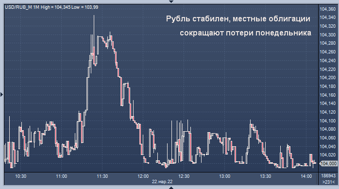 Рубль стабилен, местные облигации сокращают потери понедельника Российский рубль мало изменился по отношению к доллару после укрепления в понедельник; рынок ОФЗ торгуется в основном в зеленой зоне после возобновления торгов в понедельник после трехнедельного перерыва. Рубль мало изменился на уровне 104,05/USD после вчерашнего роста на 0,8%.