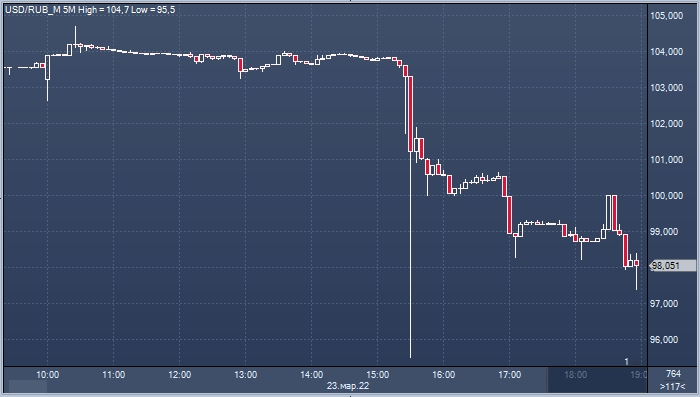 Курс доллара к рублю на Московской бирже интервалами 5 минут