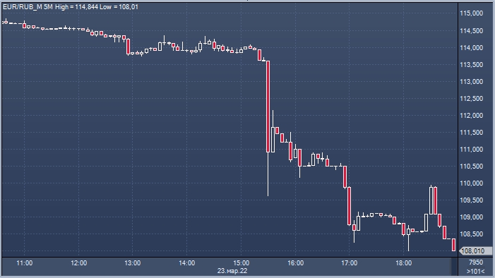 Курс евро к рублю на Московской бирже интервалами 5 минут