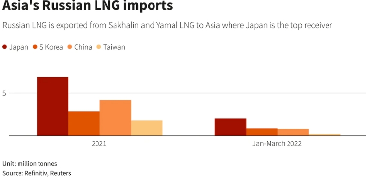 Согласно данным Refinitiv о торговых потоках, в 2021 году Япония импортировала из России 6,84 млн тонн СПГ, что составляет почти 9% ее импорта СПГ.