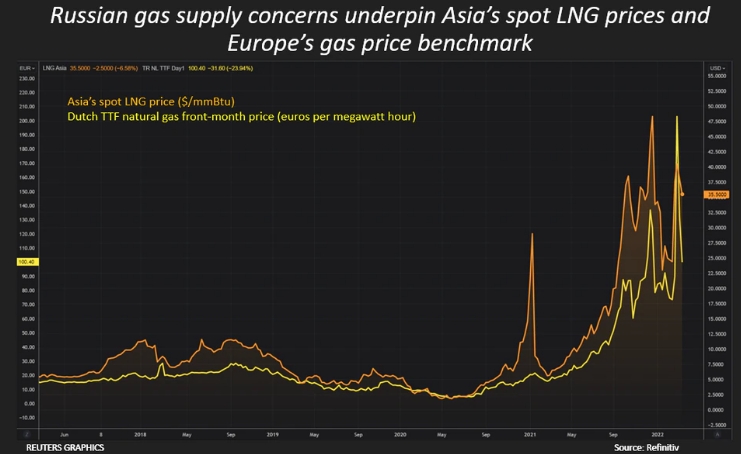 Опасения по поводу поставок российского газа лежат в основе спотовых цен на СПГ в Азии и эталонных цен на газ в Европе. График Reuters