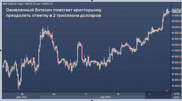 На максимуме понедельника в 47 765 долларов лидер рынка биткоин пробился выше узкого диапазона 34 000–44 000 долларов, в котором он торговался большую часть 2022 года. Благодаря устойчивому росту с минимума чуть выше 40 000 долларов 21 марта он прибавил 18%.