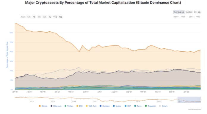 Рыночная капитализация биткоина достигла 902 миллиардов долларов, но ему еще предстоит пройти долгий путь, чтобы вернуть 1 триллион долларов, которыми он располагал в ноябре. Несмотря на то, что биткоин по-прежнему является доминирующей криптовалютой, его рыночная доля также постепенно снижалась с 70% от общей капитализации в начале 2021 года до 42% в настоящее время.