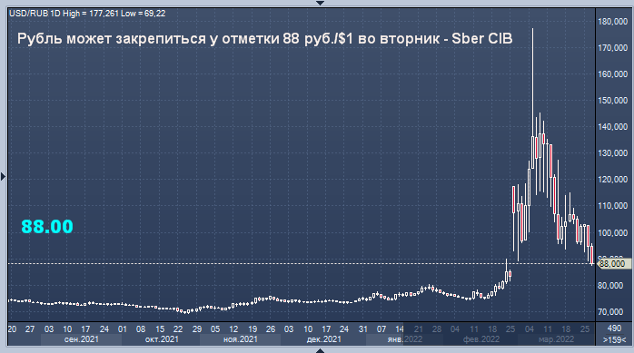 "Рубль подорожал в понедельник на 6%, до 90 руб./$1. Основная причина - преобладание предложения валюты, которую экспортёры активно продают, над спросом, ограниченным из-за контроля над движением капитала. Во вторник рубль может закрепиться у отметки 88руб./$1", - поясняют аналитики.