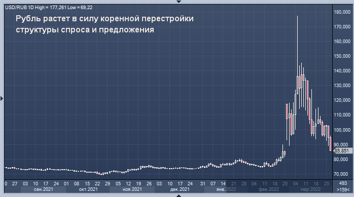 Ну а чему тут удивляться, если нефть была по минус 37, а потом 137, то и рубль после 187 на Алиэкспрессе сегодня 87 на Мосбирже. Это уже не тот рынок, что мы знали, и проводить параллели совершенно некорректно. Ранее рынок был свободен от правила обязательной продажи выручки экспортерами в 80%, ранее иностранные игроки принимали участие в торгах. Сейчас нет этих двух базовых условий. И даже при отсутствии интервенций ЦБ по поддержанию рубля (в силу того, что у него просто нет валюты) рубль растет, потому что предложение валюты в моменте превышает спрос на нее. И в этом во всем теперь нужно разбираться: анализировать по-новому структуру спроса и предложения.