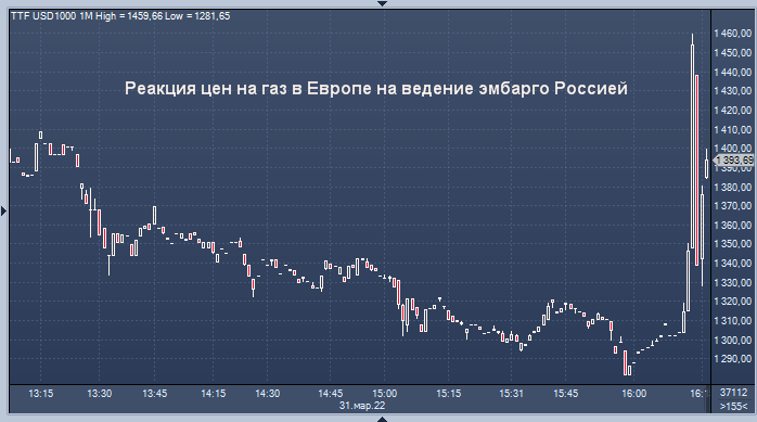 График цены ближайшего (апрельского) фьючерса на спотовый индекс газа TTF на бирже ICE Futures (в долларах США за тысячу кубометров) интервалами в 1 минуту