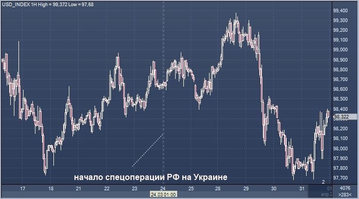 Доллар привлек потоки средств инвесторов, направленные на поиск «тихой гавани» после начала спецоперации России на Украине 24 февраля. По итогам марта индекс доллара вырос на 1,6% и примерно подорожал на 2,8% в первом квартале.