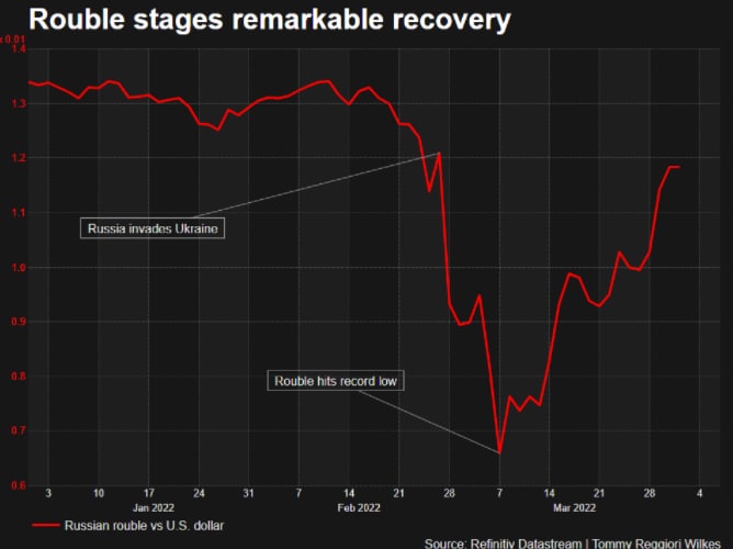 Рубль молниеносно восстановился до уровней, достигнутых в последний раз за несколько дней до начала военной спецоперации России в Украине, вопреки прогнозам, чтоконфликт спровоцирует его свободное падение.