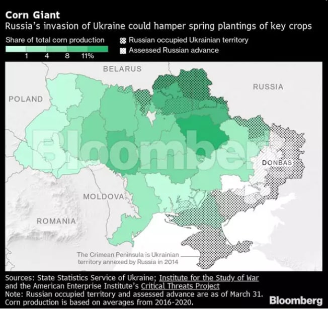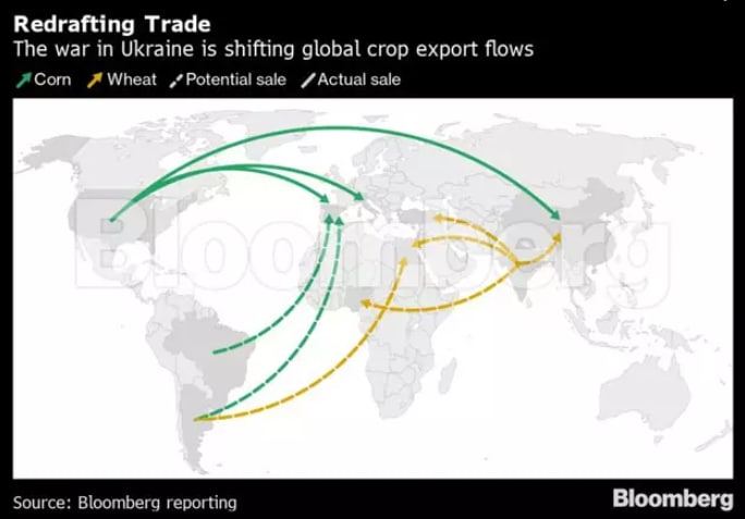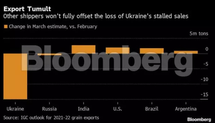 Украина является одним из крупнейших в мире экспортеров кукурузы, пшеницы и подсолнечного масла, потоки которых в значительной степени остановились. Экспорт зерна в настоящее время ограничен 500 000 тонн в месяц, по сравнению с 5 миллионами тонн до военного конфликта, что составляет убыток в размере 1,5 миллиарда долларов, сообщает министерство сельского хозяйства страны. Урожай из России — крупнейшего в мире экспортера пшеницы — все еще идет, но остаются вопросы по доставке и оплате будущих грузов.