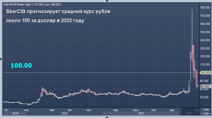 Банк России после того, как сумел вернуть курс к более-менее нормальным уровням, начал постепенно ослаблять ограничения на движения капитала. Текущие котировки рубля к доллару около 84 обнаружили спрос на американскую валюту. Импорт со временем начнет восстанавливаться. В дальнейшем увеличатся возможности проводить капитальные операции с валютами развивающихся рынков. Все это увеличит спрос на иностранную валюту. Поэтому средний курс рубля в 2022 году может составить 100 руб./$1, считают аналитики. С другой стороны, ожидается рост инфляции, что также будет играть против рубля.