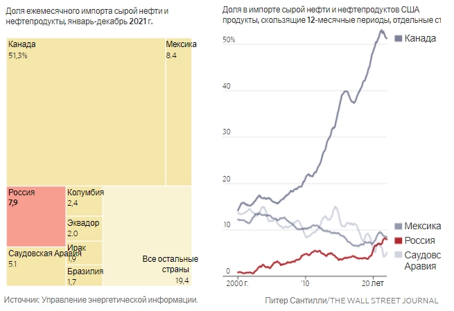 США по-прежнему потребляют гораздо больше нефти, чем добывают, что требует импорта некоторых объемов черного золота. Но страна меньше зависит от российской нефти, чем Европа, и получала лишь небольшую часть импортируемой нефти из России. Америка получает большую часть своего импорта сырой нефти из Канады, Мексики и Саудовской Аравии. Небольшие объемы поставляют страны Латинской Америки и Западной Африки.
