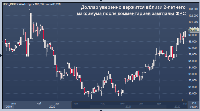 Индекс доллара, который измеряет курс доллара по отношению к шести аналогичным валютам, вырос к 10:50 мск среды до 99,59, ранее коснувшись отметки 99,76, что является самым высоким показателем с мая 2020 года.