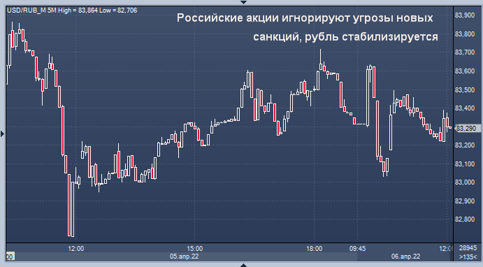 Российский рубль практически не изменился за день на уровне 83,42 по отношению к доллару и вырос на 1,1% до 90,52 по отношению к евро, что близко к уровням, наблюдавшимся до того, как Россия направила десятки тысяч военнослужащих на Украину 24 февраля.