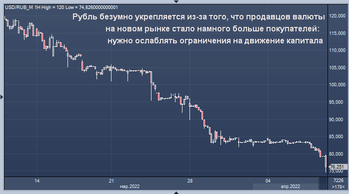 Рубль раскрепостился, сбросил санкционные оковы и примерил отечественные скрепы. Мы ранее писали, что на таком рынке возможно любое безумие, хоть 65, которые завещал Греф. Эксперты уже предупредили, что рынок поменялся, у него другая структура спроса и предложения, поэтому курс стал искусственным. Теперь Банку России пришло время смягчать ограничения на движение капитала, иначе экономика начнет задыхаться, особенно в условиях ожиданий сокращения ВВП на 10-20%, роста инфляции до 20-30% и безработицы до 10%. Но я примерно догадываюсь, какую цель ставит регулятор (если опустить его оплошную медлительность). Крепкий курс убивает инфляцию. А у нашего регулятора мандат только на борьбу с инфляцией, хотя я догадываюсь, что об экономическом росте он тоже думает.