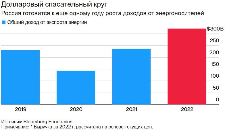 Несмотря на то, что Россия остается в основном отрезанной от мировой экономики, Bloomberg Economics ожидает, что в этом году страна заработает почти 321 миллиард долларов от экспорта энергоносителей, что более чем на треть больше, чем в 2021 году.