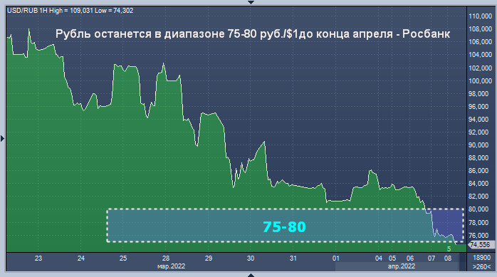 "Мы полагаем, что рубль уже переоценен ввиду низкой гибкости ценообразования, а также негативного эффекта для бюджетных поступлений на фоне расширения ценовых дисконтов за экспортируемые российские товары. Ожидаем, что до конца апреля на валютном рынке будет преобладать консолидация в интервалах 75-80 руб./$1 и 80-85 руб./EUR1 под воздействием сезонных факторов торгового баланса. Тем не менее средне- и долгосрочные перспективы будут зависеть от условий внешней торговли в последующие месяцы и скорости смягчения Банком России ограничений на движение капитала", - полагают аналитики Росбанка.