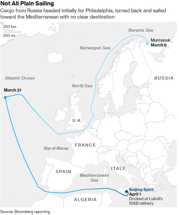 Не все так гладко для танкеров, перевозящих российскую нефть. Судно Beijing Spirit пересекло Атлантический океан с грузом сырой нефти Лукойла Варандей, загруженным в Мурманске, и первоначально взяло курс на Филадельфию. На полпути через океан корабль повернул назад, направляясь в Средиземное море, чтобы в конечном итоге разгрузиться на собственном нефтеперерабатывающем заводе ISAB «Лукойла» на итальянском острове Сицилия.