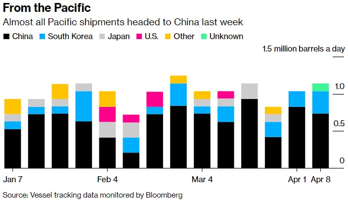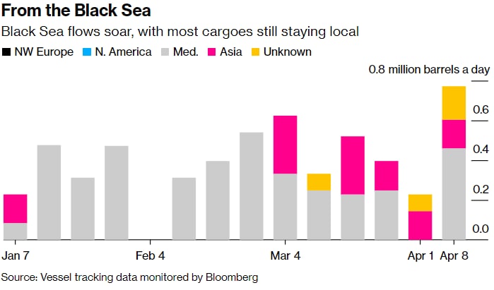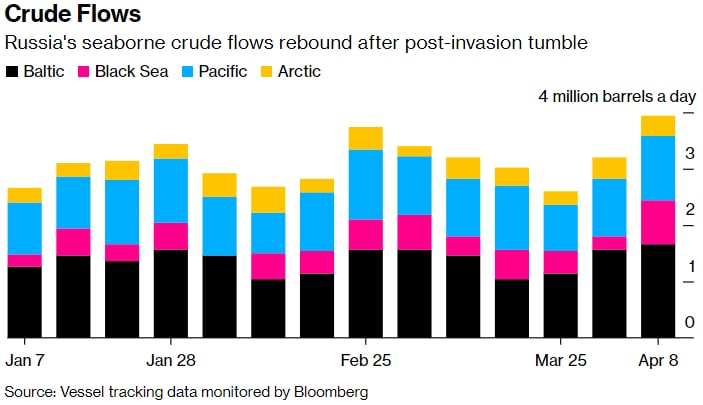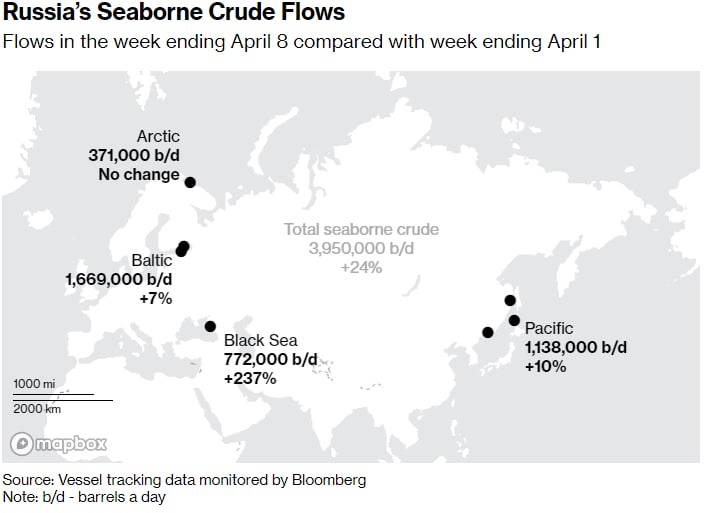 Поставки за семь дней до 8 апреля продолжили рост, начавшийся на предыдущей неделе, после постоянного падения с момента начала военной операции России в Украине 24 февраля — согласно трекеру Bloomberg News всей нефти, покидающей экспортные терминалы страны на океанских танкерах.