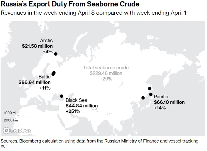 Благодаря сочетанию более высоких объемов экспорта и увеличения пошлины за баррель в апреле Кремль заработал около 230 миллионов долларов на морском экспорте сырой нефти за неделю до 8 апреля, исходя из расчетов суммы, подлежащей уплате за каждый отправленный груз в российских портах на той неделе.