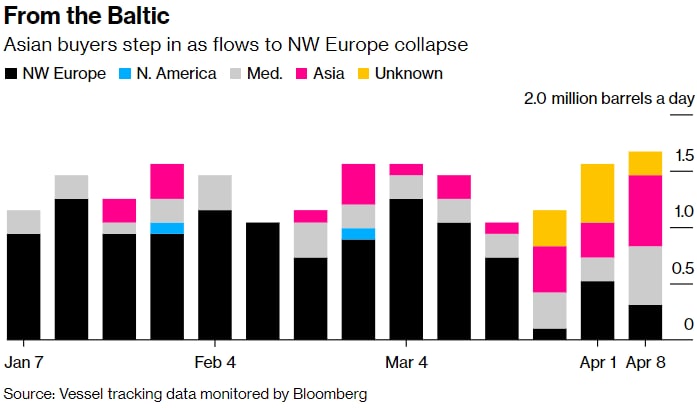 Российские морские потоки сырой нефти. Потоки за неделю, закончившуюся 8 апреля, по сравнению с неделей, закончившейся 1 апреля. Источник: данные отслеживания судов, проверенные Bloomberg.