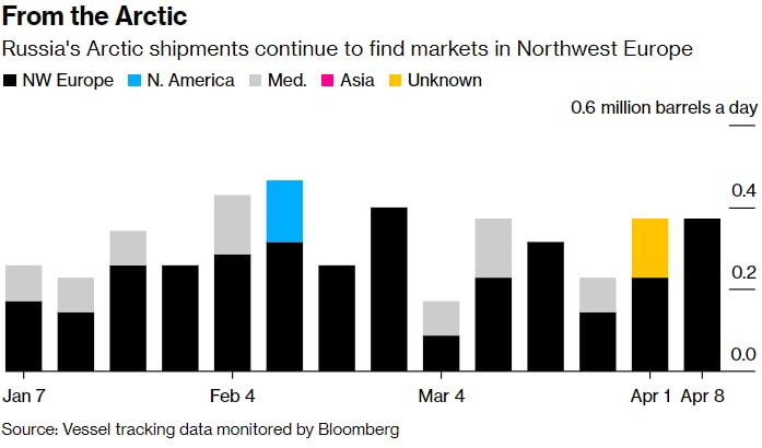 Российские арктические поставки продолжают находить рынки сбыта в Северо-Западной Европе. Источник: данные отслеживания судов, проверенные Bloomberg.