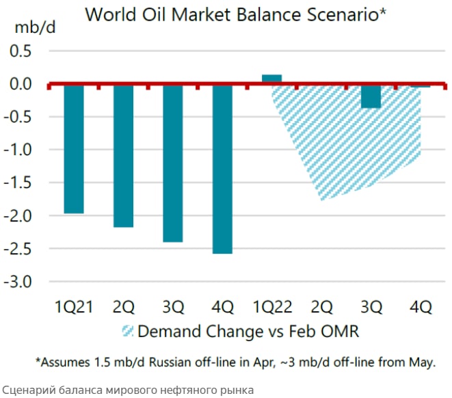 «Начиная с мая, производство может сократиться примерно на 3 миллионов баррелей в сутки, поскольку начнет полноценно проявляться влияние расширяющегося добровольного эмбарго на российскую нефть со стороны клиентов».