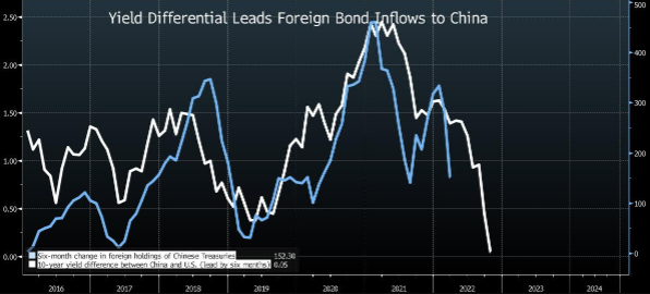 Спред доходности 10-летних гособлигаций Китая и США (белым, правая ценовая шкала) и шестимесячное изменение позиции нерезидентов в госдолге Китая (голубым, правая шкала). Источник: Bloomberg