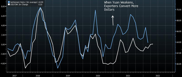 Трехмесячное изменение курса юаня в процентах (белым, левая ценовая шкала) и коэффициент конвертации валютных поступлений экспортеров (голубым, правая шкала). Источник: Bloomberg